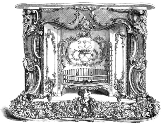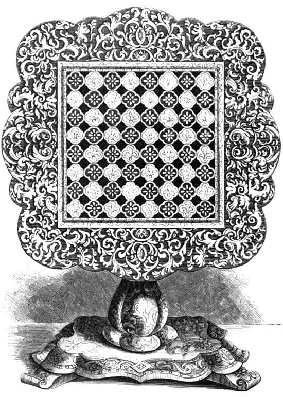 The above is a sketch of a stove. This is one of the more garish examples, with so much ornament tacked on it looks like it’s overflowing. Here’s an illustration of a chess table, and here again note the faux leaves used to form the pattern around the playing board:
