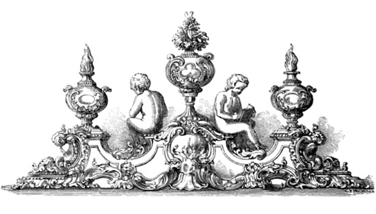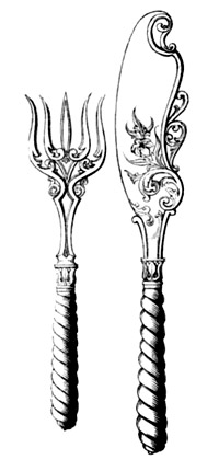 On the right is a sketch of a fish cleaver and a fork. As above, the ornament permeates the design so much that the structure of the work appears to be made of ornament. What this sort of design tries to achieve is a sense of awe as you look upon the flood of intricately carved details and decorations. All of the Renaissance symbols of luxury and class are thrown at the work and then multiplied tenfold in an attempt to achieve a feeling of grandeur and magnificence. But this eagerness to use ornament at every point also pushes the work to an extreme – it becomes garish and bloated.