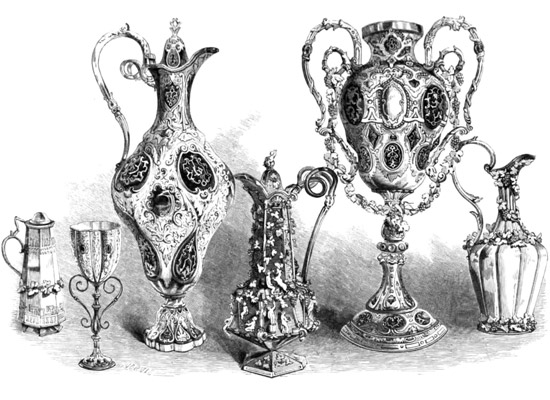 There is a catalogue of goods showcased at the exhibition, which Google has been very kind to scan for us free of charge (you can view it here). It’s a great big book, but it does contain a lot of detailed sketches which are worth taking a look at. I’d like to share some of the more elaborate ones here with you so you can see how ornament was used in Victorian design – or at least in the more extreme designs showcased at The Great Exhibition. Here’s a sketch of a set of flagons, a vase, and a goblet: